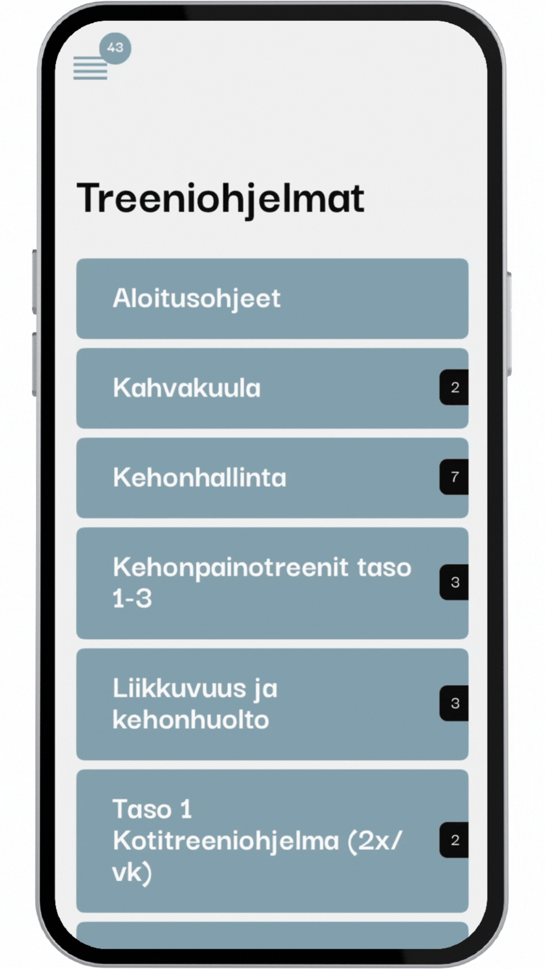 Voit valita kattavasta treeniohjelmapankista, juuri sinun tavoitteitasi ja tarpeitasi vastaavat treenit ja ohjelmat. Olipa kyseessä painonpudotus, lihaskasvu tai yleinen hyvinvointi, meillä on sinulle sopiva polku. Kaikki tarvittava on koottu yhteen paikkaan, ja treenit ovat saatavillasi juuri silloin kun sinulle parhaiten sopii missä ja milloin vain!