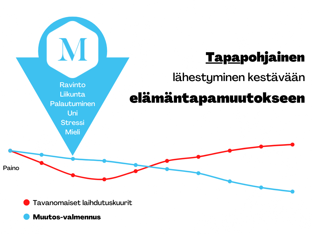 Moni painonpudotusta lupaava ohjelma perustuu vanhanaikaisiin käsityksiin, joissa kehutaan nopeita tuloksia ja kielletään tiettyjä ruokia. Tämä johtaa lähinnä painon hetkelliseen laskuun, jonka jälkeen se palaa nopeasti takaisin. Muutos- valmennus pyrkii muuttamaan suhdettasi elämäntapoihin, kuten ruokailuun niin, että tehdyt muutokset ovat pysyviä. Valmennuksen kesto on 12kk, joten on paljon todennäköisempää, että vuoden aikana harjoitetut tavat ja saavutetut tulokset pysyvät valmennuksen jälkeenkin.