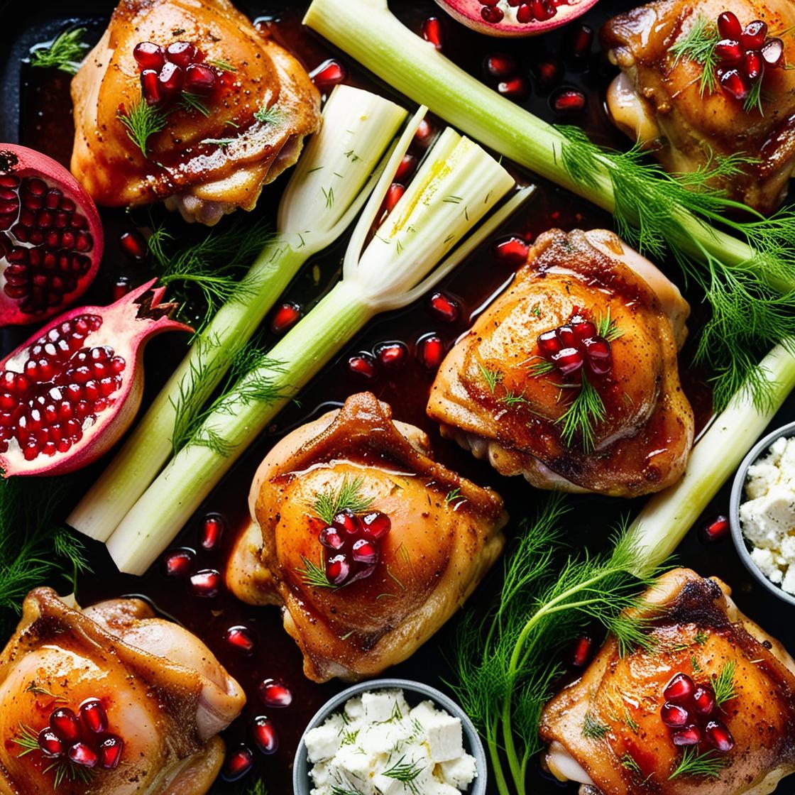 1.Lämmitä uuni 200 asteeseen (kiertoilma 180C). Laita kananpalat ja fenkolit kulhoon, lisää harissa, 2 rkl granaattiomenasiirappia ja reilusti mausteita. Sekoita hyvin. Levitä fenkoliviipaleet syvälle uunipellille yhdeksi kerrokseksi, ja asettele kananpalat niiden päälle nahkapuoli ylöspäin. Paahda uunissa 20 minuuttia.